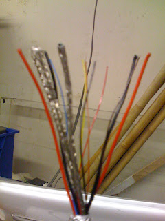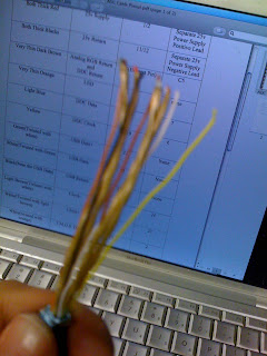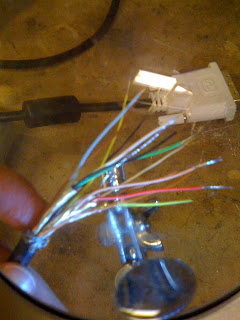 I began by cutting off the ADC plug from the single wire the came out the back of the monitor and then proceeded to strip off the rubber sheath, cut off shields, and strip the internal cables. The actual cables were 26-gauge wires -- they were very thin and looked very fragile! I used a magnifying glass to help peel off the shielding. Some of the internal wires were grouped and additionally shielded; I exposed them at a shorter length to prevent cable confusion (there were multiple cables of the same color). I repeated the process for the DVI cable: first cutting it in half, then stripping the wires, and finally stripping the wires which were enclosed in a further layer of shielding. Stripping all the cables took a good hour and a half.